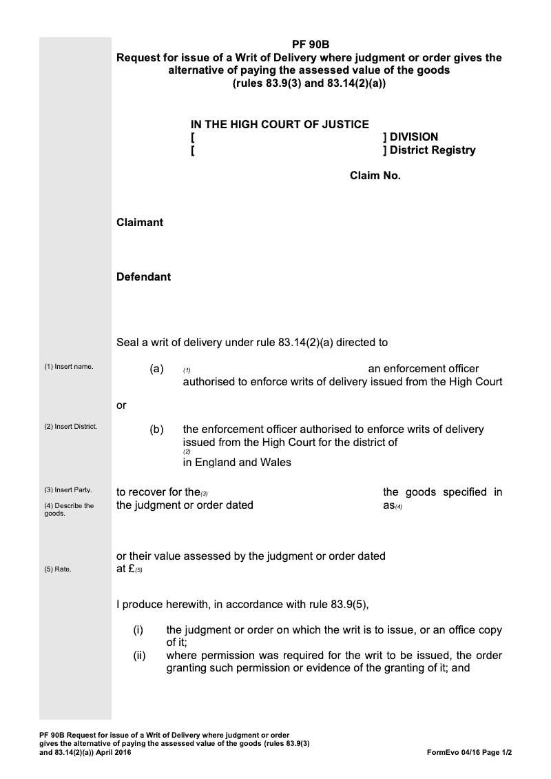 Request for issue of a Writ of Delivery where judgment or order gives the alternative of paying the assessed value of the goods (rules 83.9(3) and 83.14(2)(a)) - electronic signature available