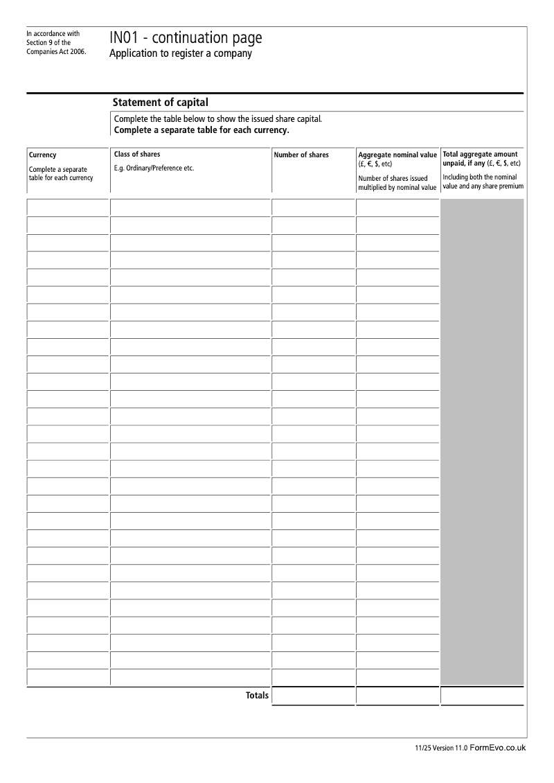 Statement of capital continuation page - IN01 Application to register a company (Section 9)